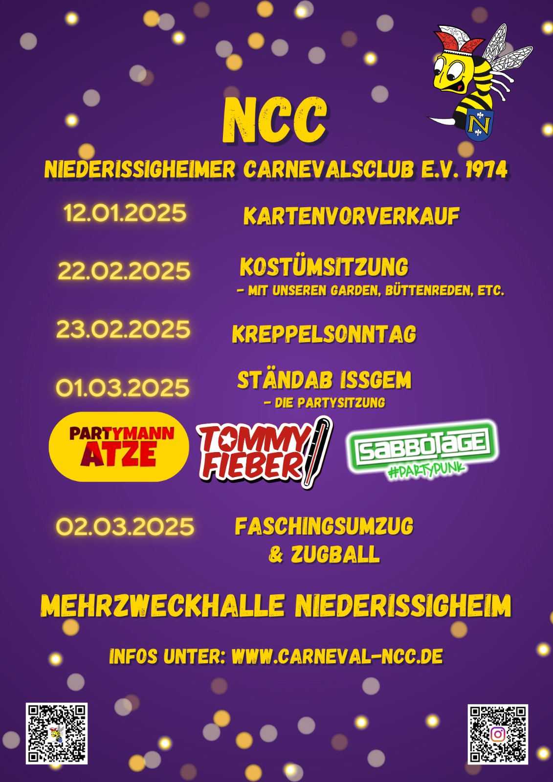 Kartenvorverkauf in der Mehrzweckhalle Niederissigheim für alle Veranstaltungen, hierzu ein paar Infos, Einlass bei „Ständab Issgem“ und beim Zugball ab 18 Jahren, für die Kostümsitzung im VVK maximal 10 Karten pro Person, für „Ständab Issgem“ und Zugball je 5 Karten pro Person.